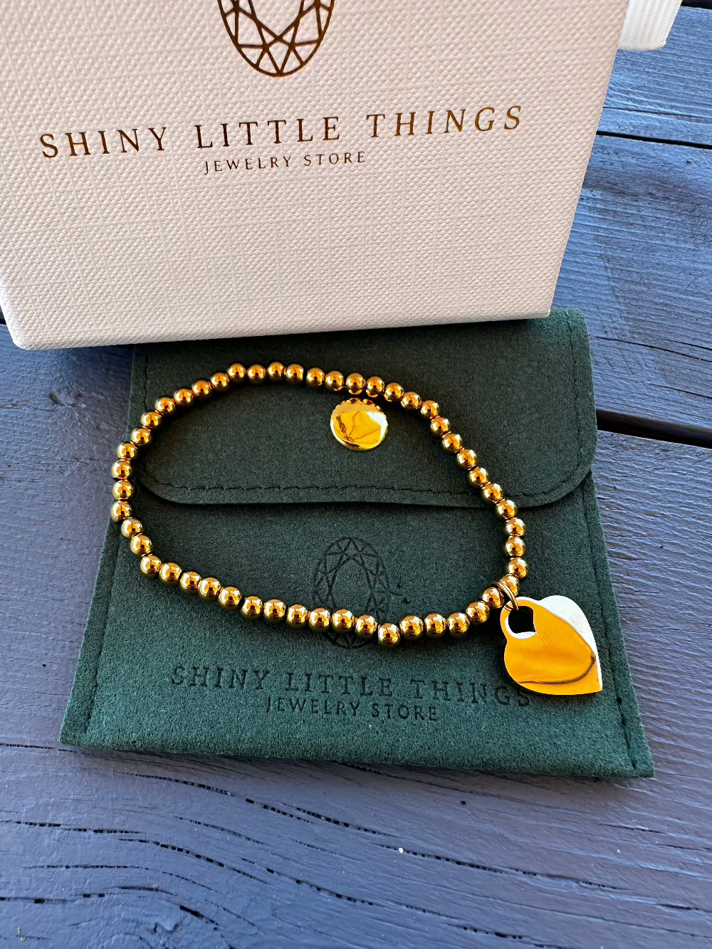 Personalize your stack with our Beaded Heart Stretch Bracelet. Featuring polished gold-toned beads and a sleek heart charm perfect for engraving, this bracelet blends sentiment with style. Whether worn alone or layered, it’s a sweet, customizable piece made to gift or keep forever.