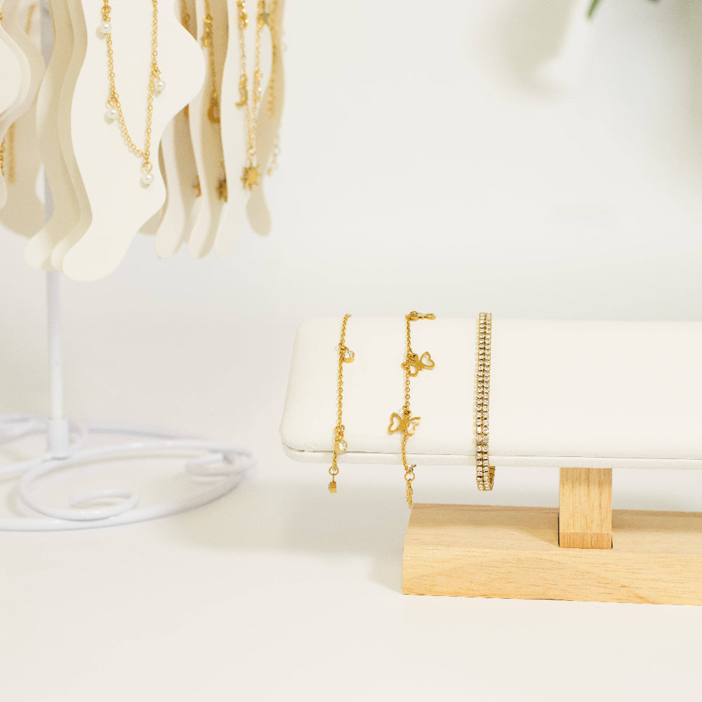 Sunshine, sparkle, and this anklet. Our Double Row Sparkle Anklet features two radiant rows of rhinestones that shimmer with every step—aka your new go-to for golden hour walks and vacay fits. Made with premium 18K Gold PVD over stainless steel, it’s waterproof, tarnish-free, and safe for everyday wear (even at the beach).
