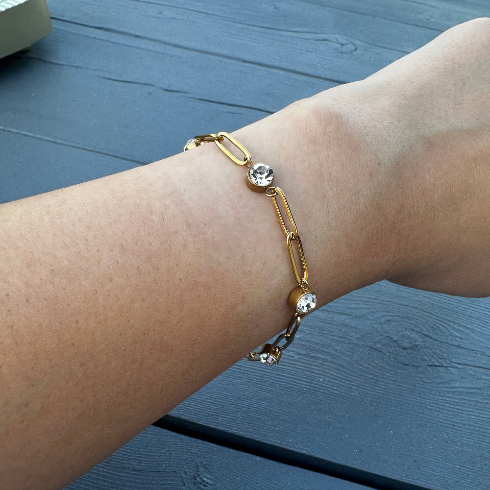 Meet your new go-to bracelet for sparkle with sophistication. Our Station Stone Paperclip Chain Bracelet adds a shimmering twist to a fan-favorite silhouette. Featuring brilliant clear stones spaced delicately along a modern paperclip chain, this piece brings a touch of refined glam to everything from bridal looks to everyday outfits.