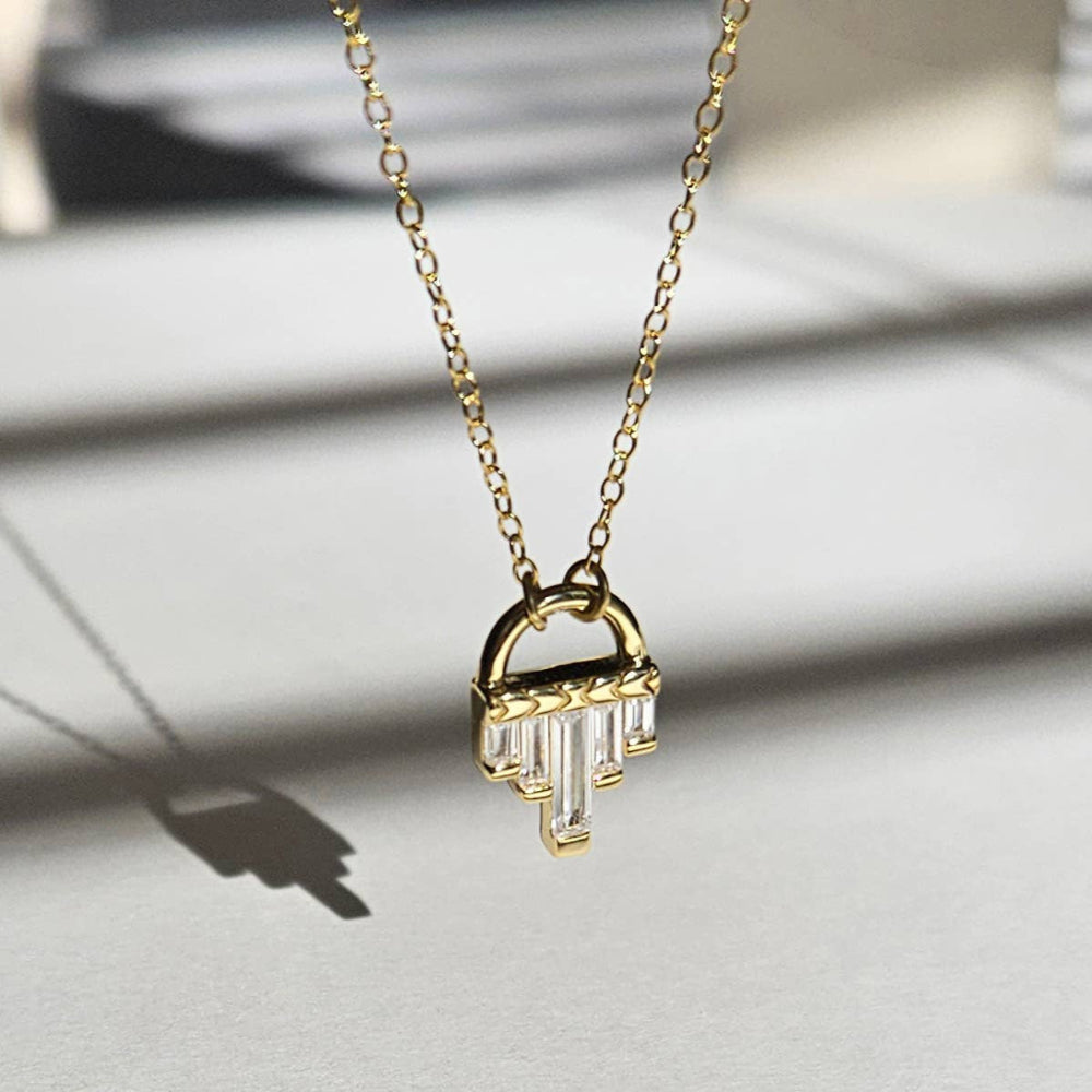 Elevate your everyday elegance with this stunning gold-plated necklace, crafted over a solid base of sterling silver for lasting quality. The pendant features a unique and modern geometric design with vertical baguette-style crystals that shimmer delicately with each movement. Suspended from a fine gold-plated chain, this piece blends timeless luxury with contemporary charm—perfect for layering or wearing solo as a statement. Whether you're dressing up for a night out or adding polish to a casual look, this necklace is your new go-to for effortless sophistication.