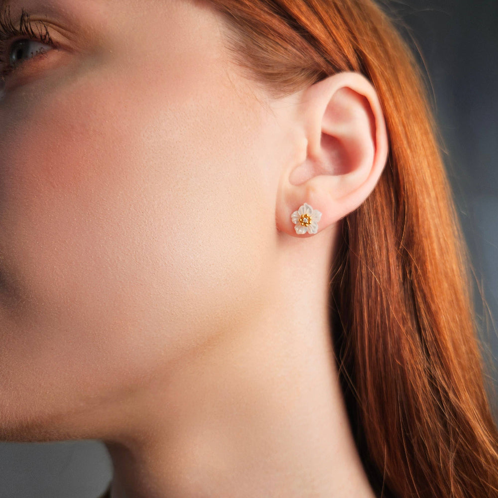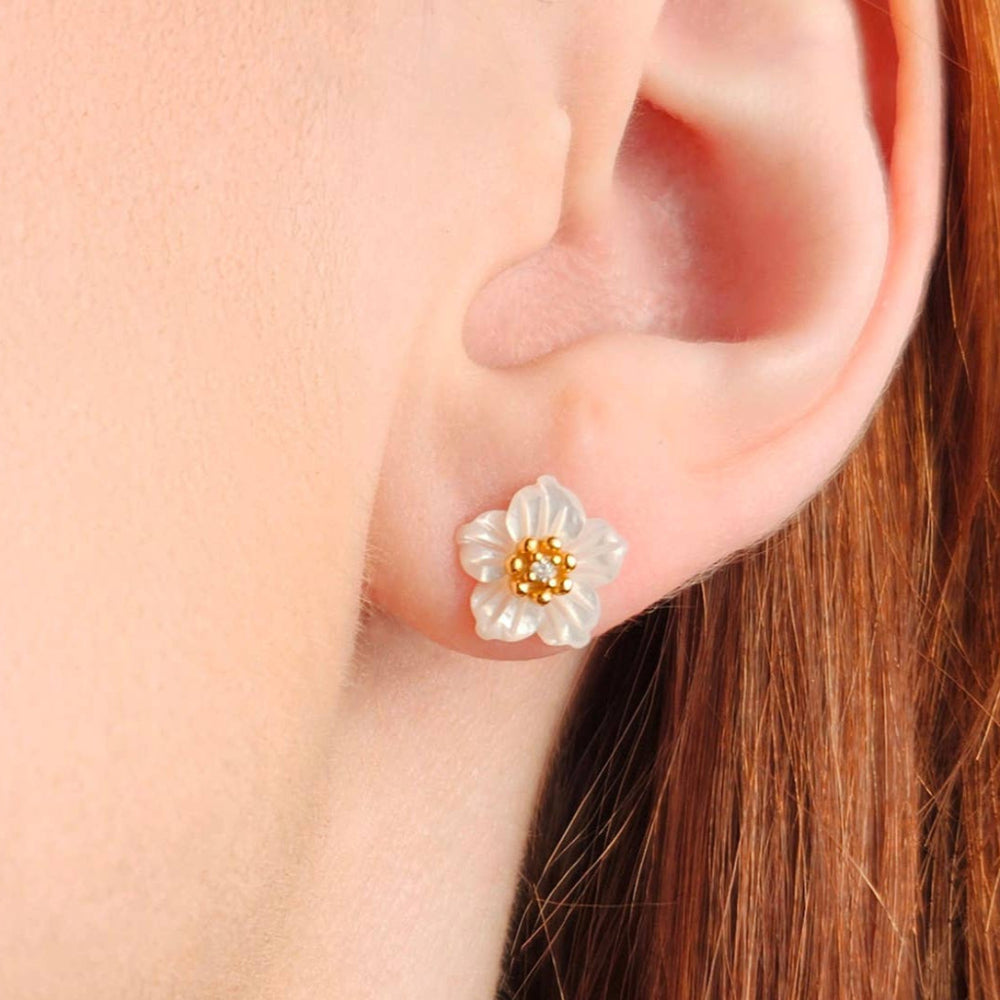 Delicate, feminine, and irresistibly charming—these floral stud earrings are the perfect way to add a touch of nature-inspired elegance to your everyday look. Crafted from gold-plated sterling silver, each earring features a finely carved white flower with a radiant gold center adorned with sparkling crystal accents. The intricate petal detailing and soft shimmer evoke the gentle beauty of blooming blossoms, making these studs a timeless accessory with a romantic twist.